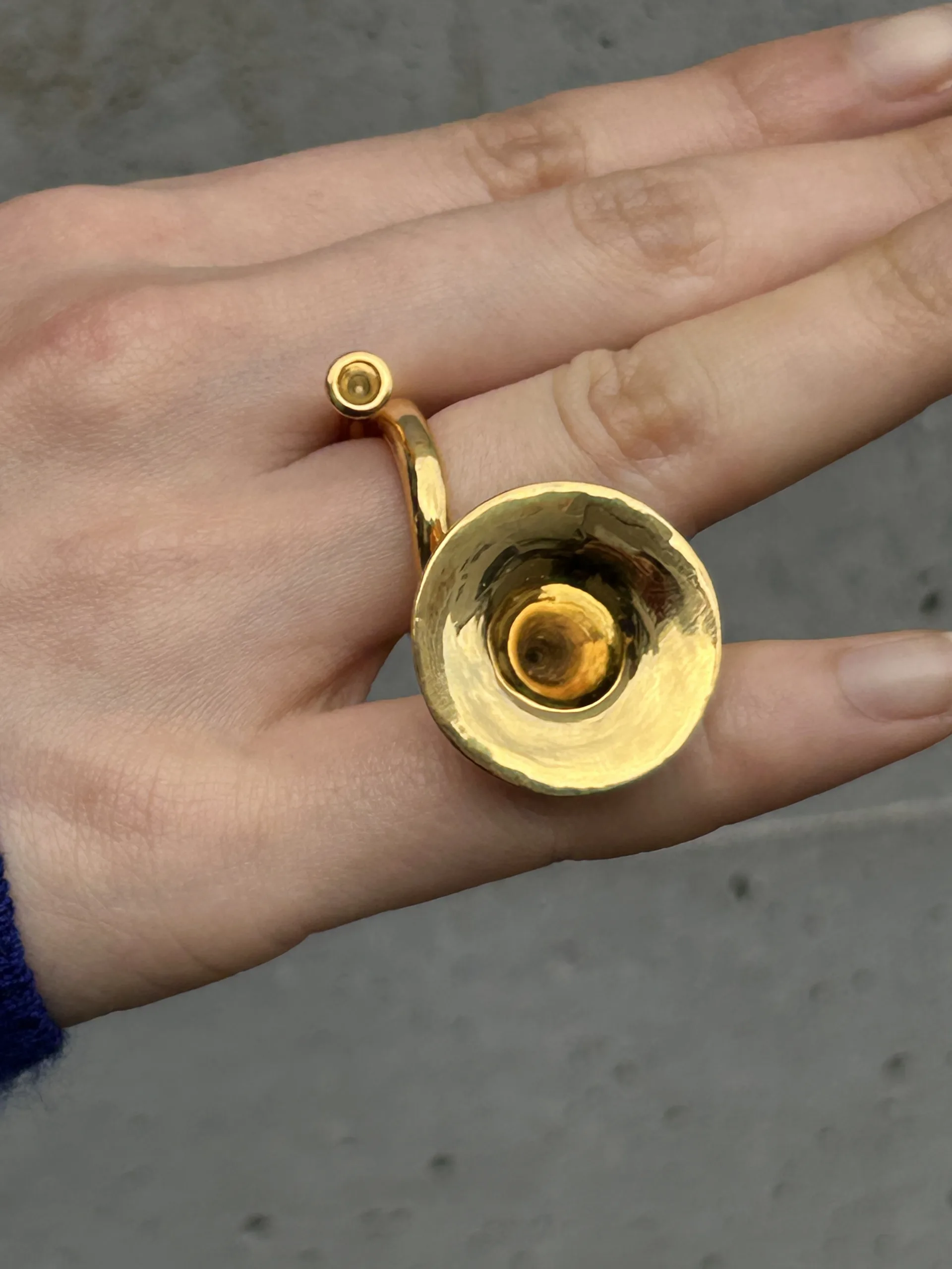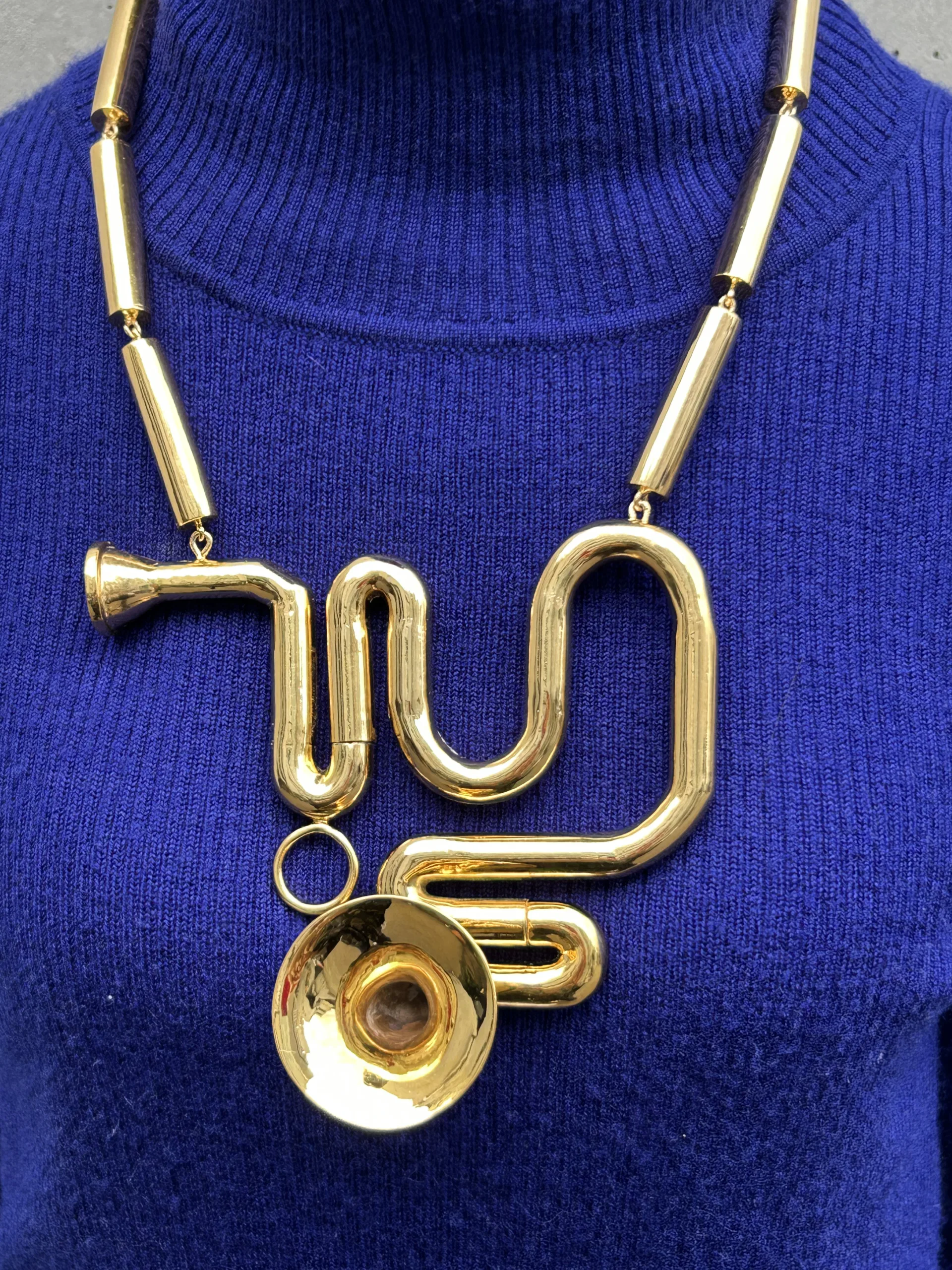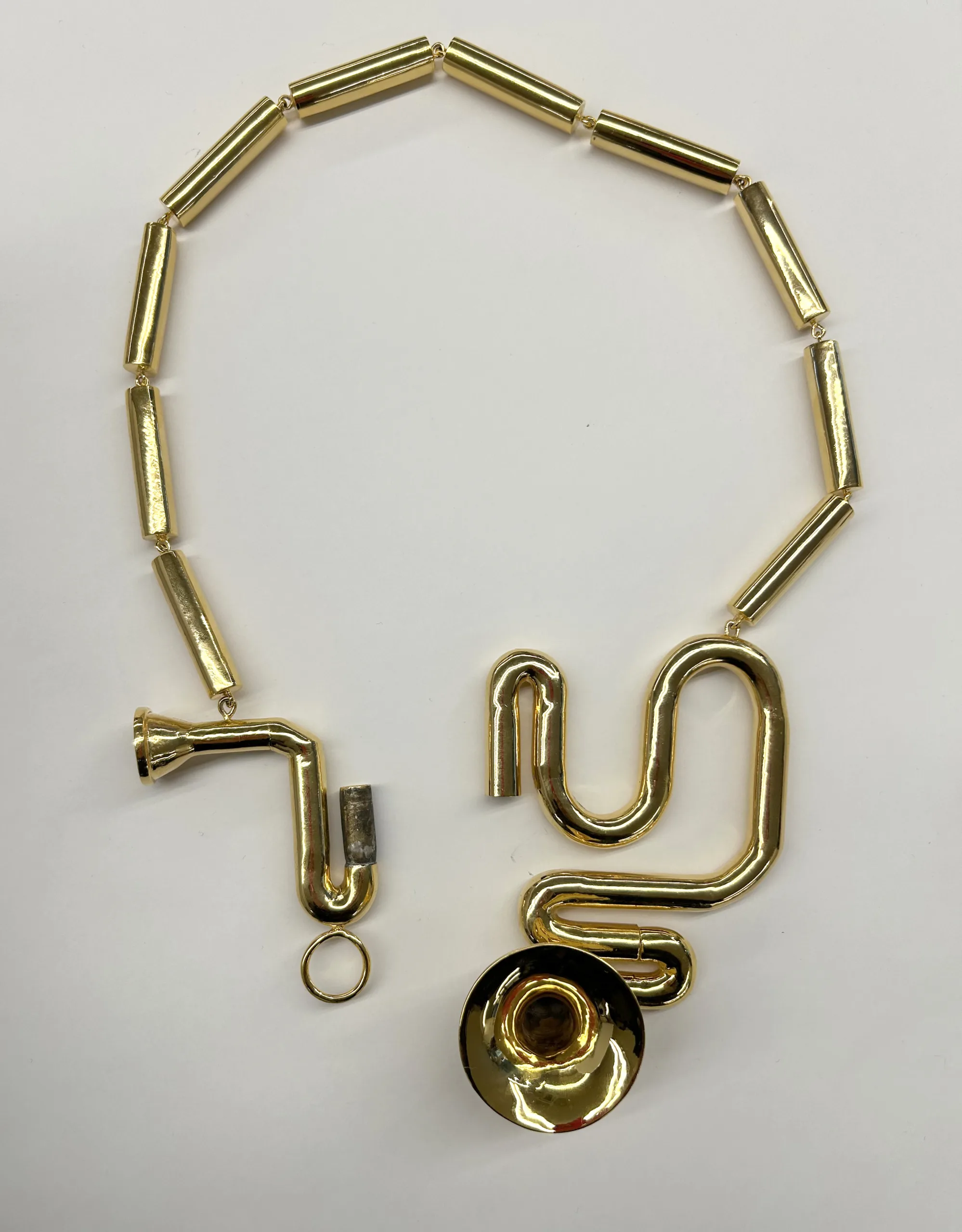 古代の金管楽器カルニクスやリュールには装飾性が備えられています。本作はその関係性を反転することを試みました。腕輪とネックレスは吹くことで奏でることができ、指輪は効率を追求して無駄のないシンプルなフォルムになったナチュラルホルンのそのままの美を表現しました。