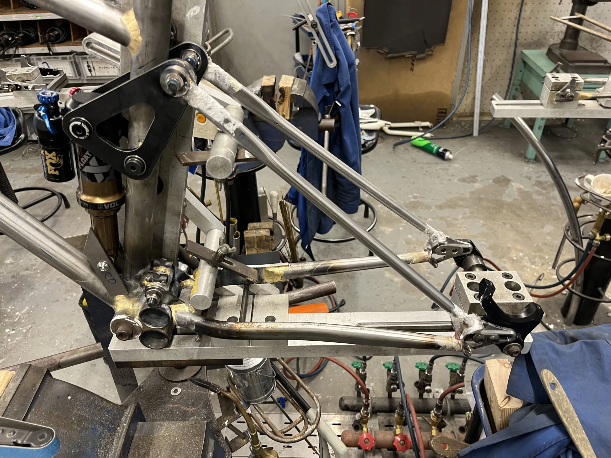 後三角制作風景。前三角との接合部、チェーンステー、エンド部を先に溶接。シートステー上のベアリングの入る所、シートステー、エンドを溶接するのに大苦戦しました。