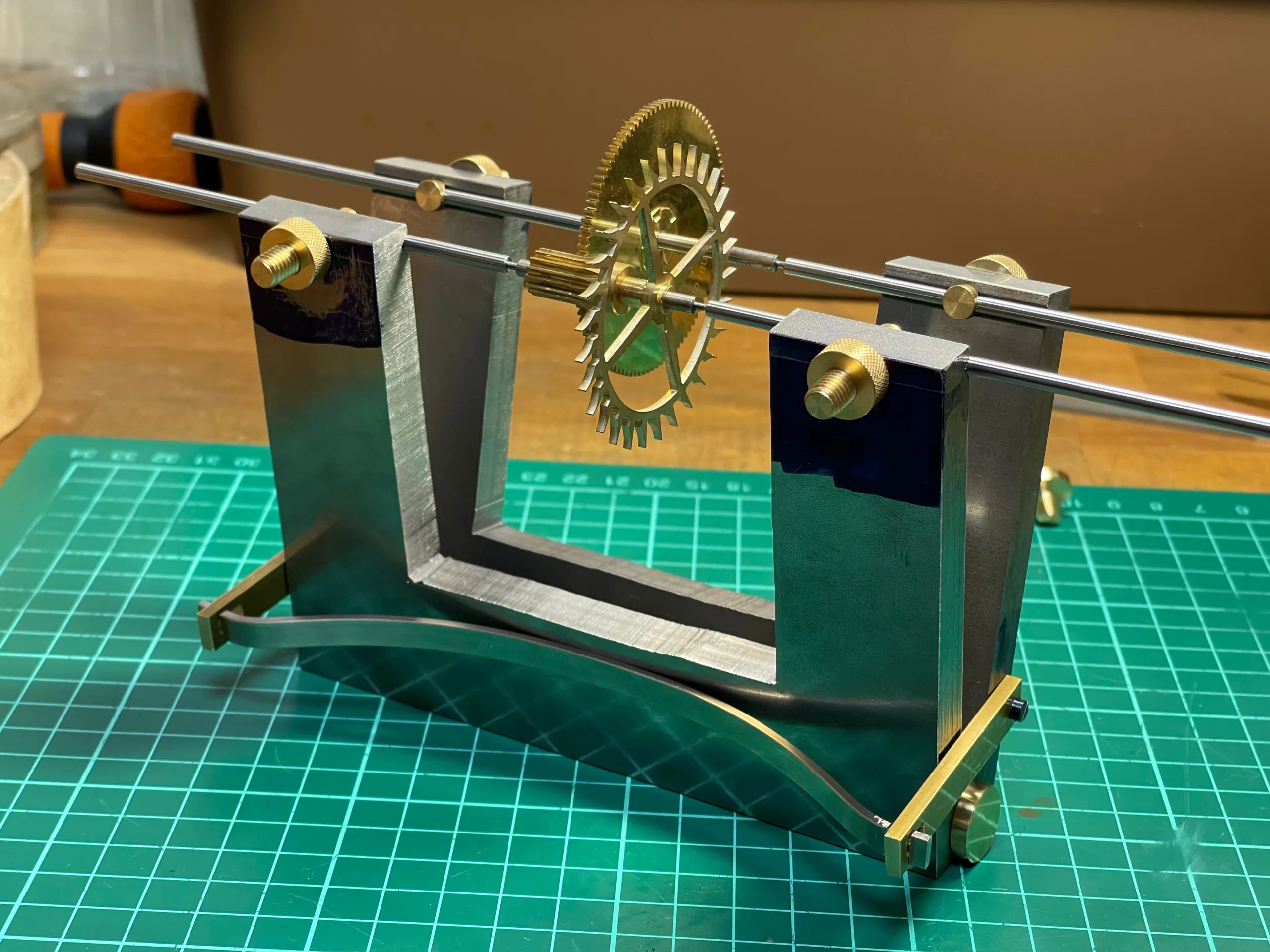 作った歯車がスムーズに動くかどうかを確認するための道具、デプスツールを自作しました。ウォッチ用のものは手に入りますが、クロック用のものはなかなか無いです。精度も2/100mmほどに収まり、初めて自作したにしては上出来です。