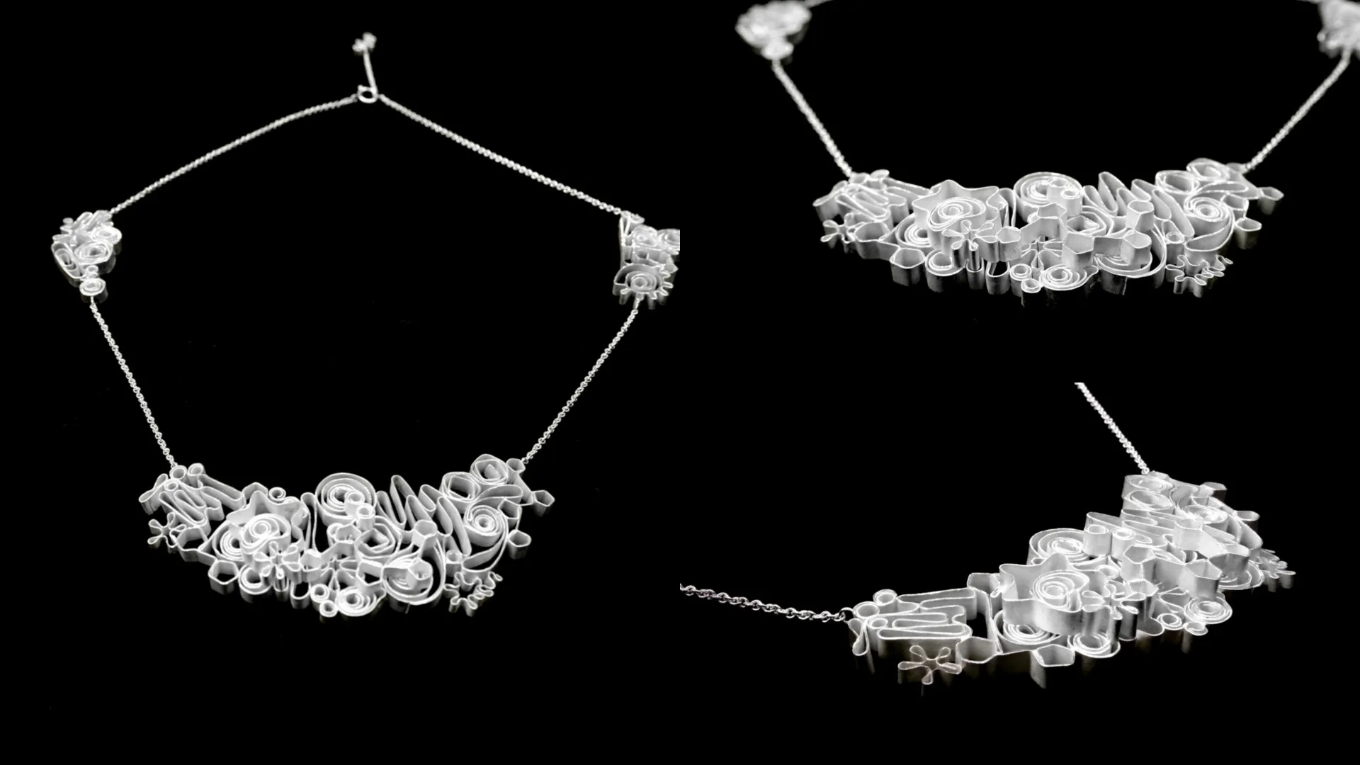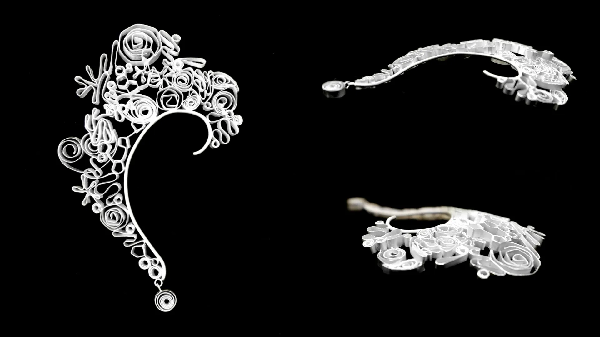 自作のドローイングとクイリングアートをモチーフに、自己表現を象徴するイヤーフックとネックレスを制作しました。外へ向かう意志や感覚の揺らぎを線の重なりで可視化し、Silverの静けさと浄化性によって安らぎを表現することで、自分の感覚に寄り添う装身具を目指しました。