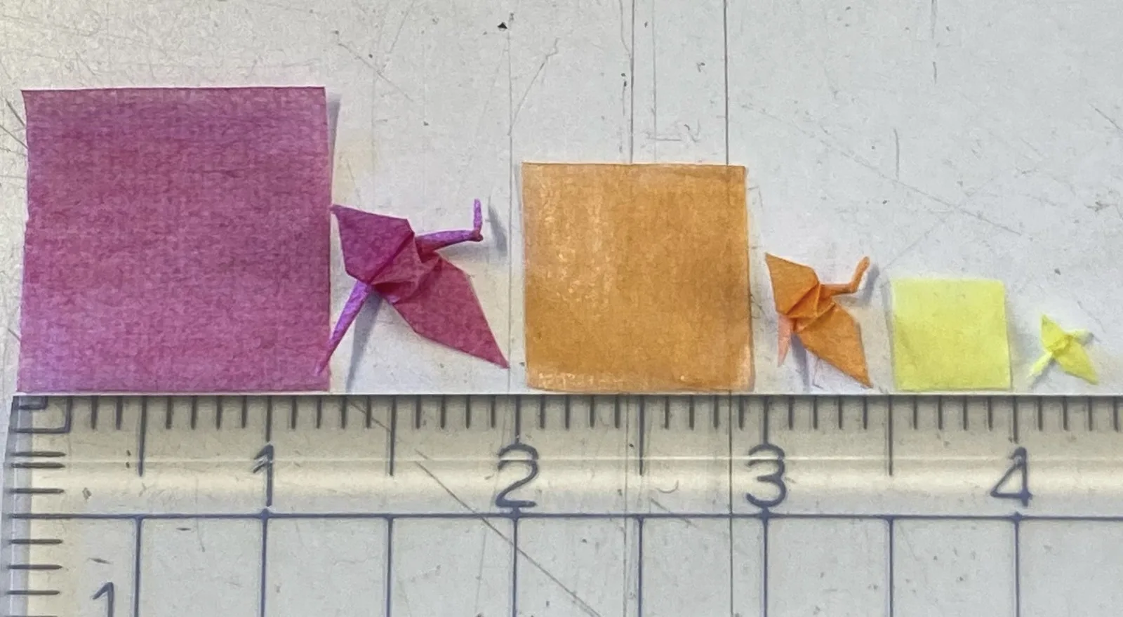 12mm、9mm、5mmの紙で折った鶴。5mmの紙で折るのにかかる時間は9分。道具は使わず自分の爪で折っている。