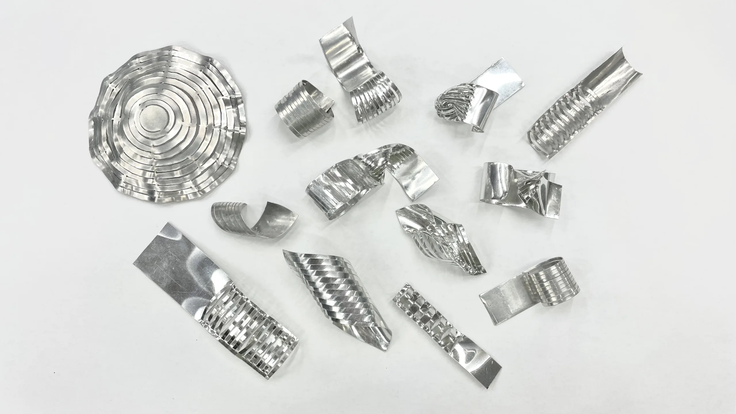 核と循環を金属でどのように表現できるかを模索する制作過程の中で生まれた作品たち。完成作品の発想の起点として、核から外へ連なり循環するスパイラル形状を試みた。同一形状の反復と大きさの差異により、一定でありながら揺らぐリズムを探っている。しなやかさと光の表情に惹かれ、素材にはアルミニウムを選択した。
