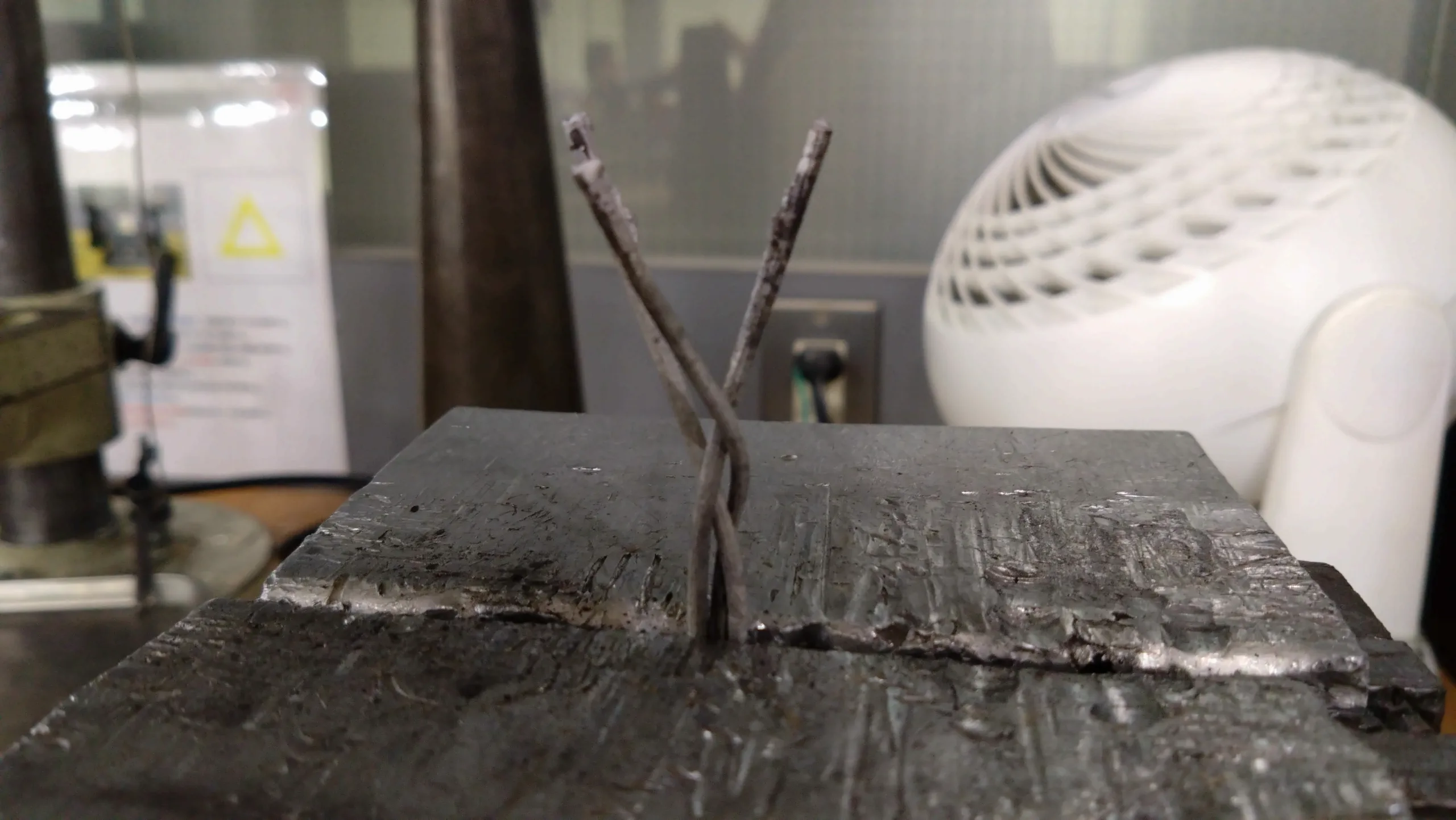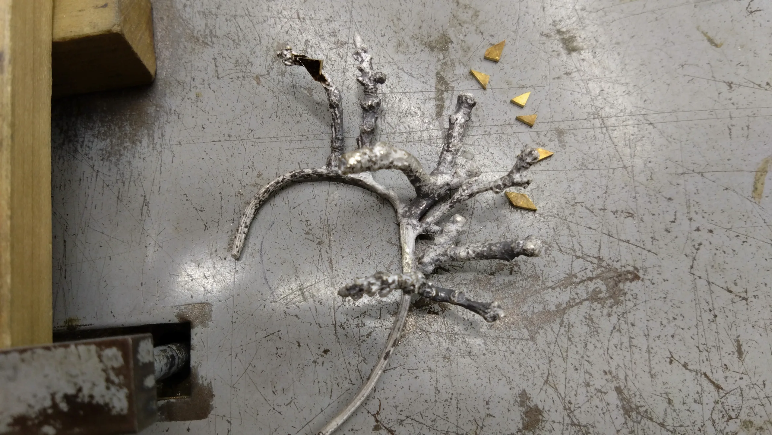 シルバーになって戻ってきたものを加工する。WAXの状態だと折れやすいため、形は作らずに鋳造したものを万力に固定し、少しずつ曲げていく。