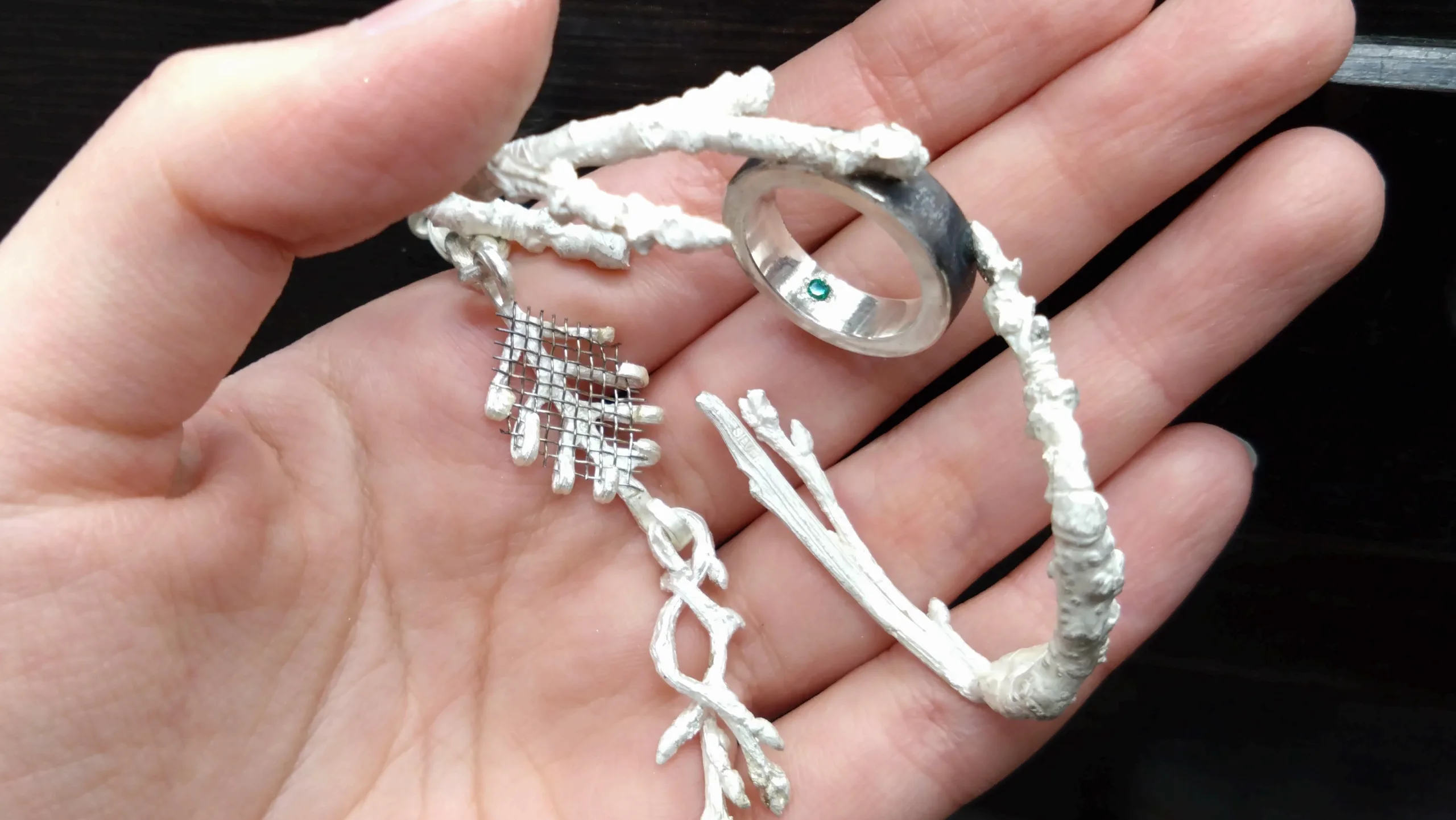 現代文明が滅びた後、知能を持つ「植物亜人」が誕生した世界を想定し、彼らにとっての信仰対象とは何かを考えた、3点のジュエリーコレクション。作品はそれぞれ、称号・呼応・浄化の役割を担い、植物亜人の生活様式や宗教観を表している。原型制作には実際の枝などを用い、植物的な構造を形に落とし込んだ。